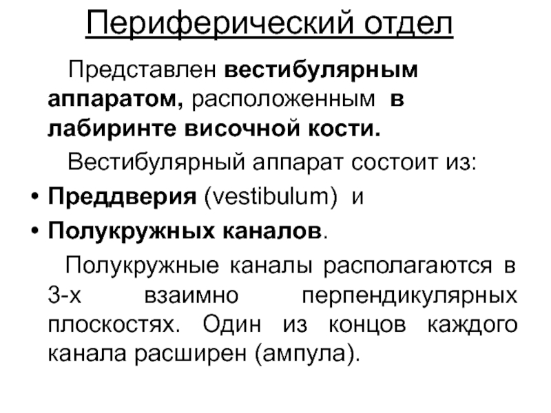 Представлен вестибулярным аппаратом, расположенным в лабиринте