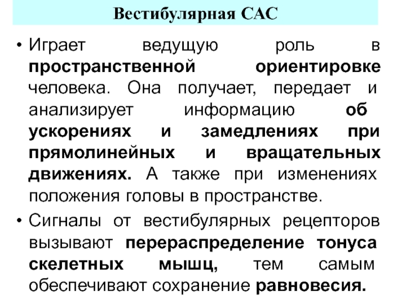Сигналы от вестибулярных рецепторов вызывают перераспределение тонуса скелетных мышц, тем самым обеспечивают сохранение равновесия.