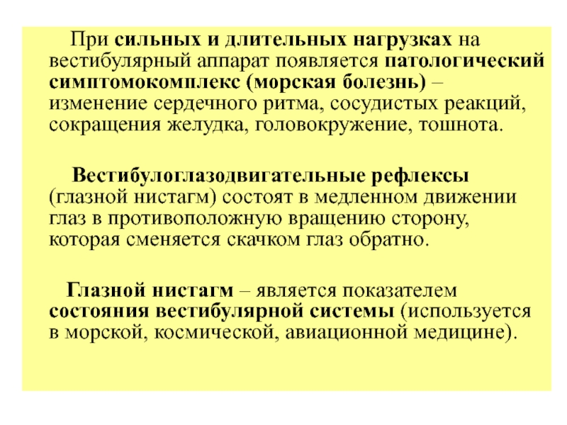 на вестибулярный аппарат появляется патологический симптомокомплекс (морская болезнь) – изменение