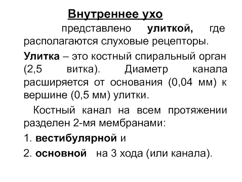костный спиральный орган (2,5 витка). Диаметр канала расширяется от основания (0,04 мм) к вершине (0,5 мм) улитки.