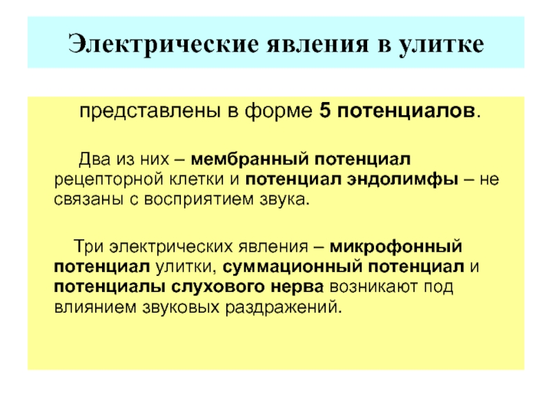 – мембранный потенциал рецепторной клетки и потенциал эндолимфы – не связаны с восприятием звука.