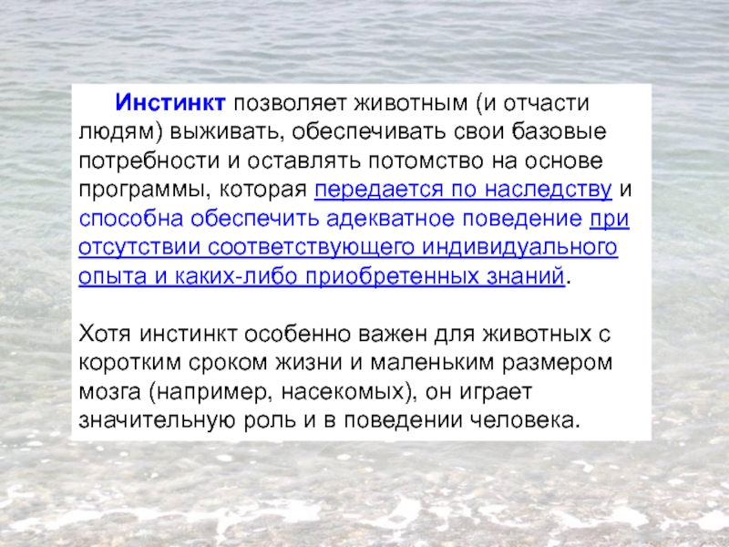 наследству и способна обеспечить адекватное поведение при отсутствии соответствующего индивидуального опыта и каких-либо приобретенных знаний.