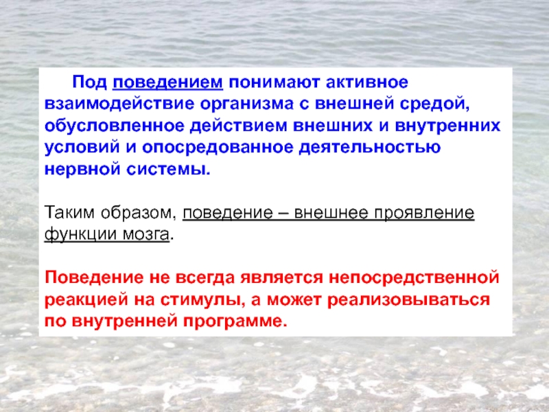 Слайд 13 Под поведением понимают активное взаимодействие организма с внешней средой, обусловленное