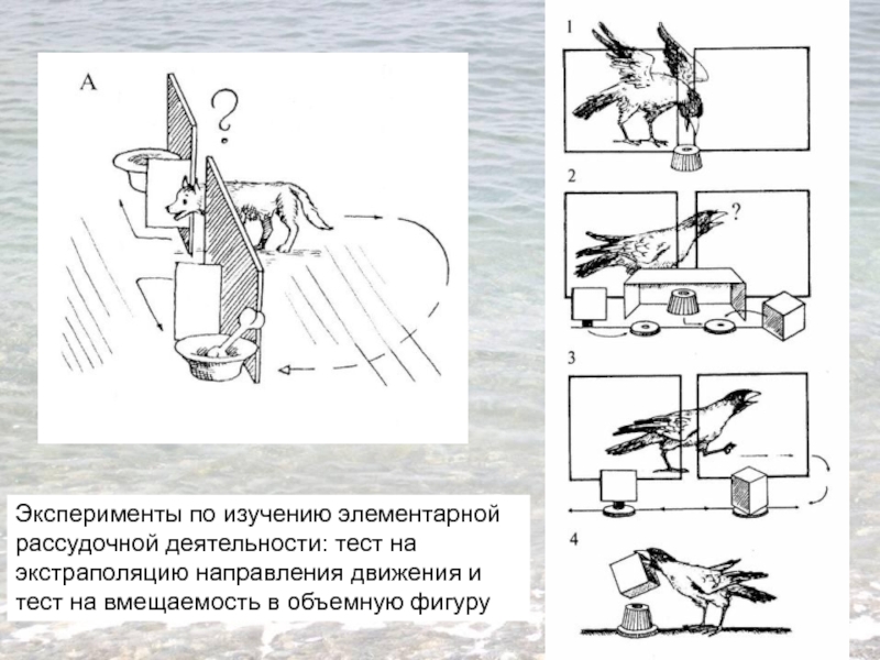 Слайд 32Эксперименты по изучению элементарной рассудочной деятельности: тест на экстраполяцию направления