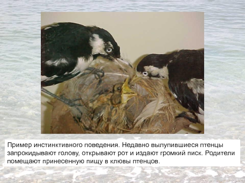 Слайд 20Пример инстинктивного поведения. Недавно вылупившиеся птенцы запрокидывают голову, открывают рот