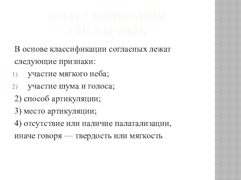 Согласные звуки образуются путем создания преград в ротовой полости для выходящей из нее воздушной струи. Преграду образуют активные (подвижные) органы, которые могут быть приближены или прижаты к различным неподвижным органам артикуляционного аппарата. Преодолевая эти препятствия, воздушная струя производит шумы, которые и определяют акустические особенности большинства согласных. Характер звучания отдельных согласных зависит от способа образования шума и места его возникновения.