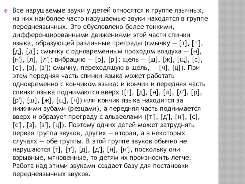 обусловлено более тонкими, дифференцированными движениями этой части спинки языка, образующей различные преграды (смычку — [т], [т'], [д], [д']; смычку с одновременным проходом воздуха — [н], [н'], [л], [л']; вибрацию — [р], [р']; щель — [ш], [ж], [щ], [с], [с'], [з], [з']; смычку, переходящую в щель, — [ч], [ц]). При этом передняя часть спинки языка может работать одновременно с кончиком языка: и кончик и передняя часть спинки языка поднимаются вверх ([т], [д], [н], [л], [л'], [р], [р'], [ш], [ж], [щ], [ч]) или кончик языка находится за нижними зубами (резцами), а передняя часть поднимается вверх и образует преграду с альвеолами ([т'], [д'], [н'], [с], [с'], [з], [з'], [ц]). Поэтому одних детей может затруднять первая группа звуков, других — вторая, а в некоторых случаях — обе группы. В этой группе звуков обычно не нарушаются [т], [т'], [д], [д'], [н], [н'], поскольку они взрывные, мгновенные, то детям их произносить легче. Работа над этими звуками создает базу для постановки переднеязычных звуков.