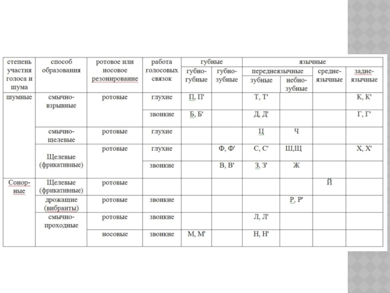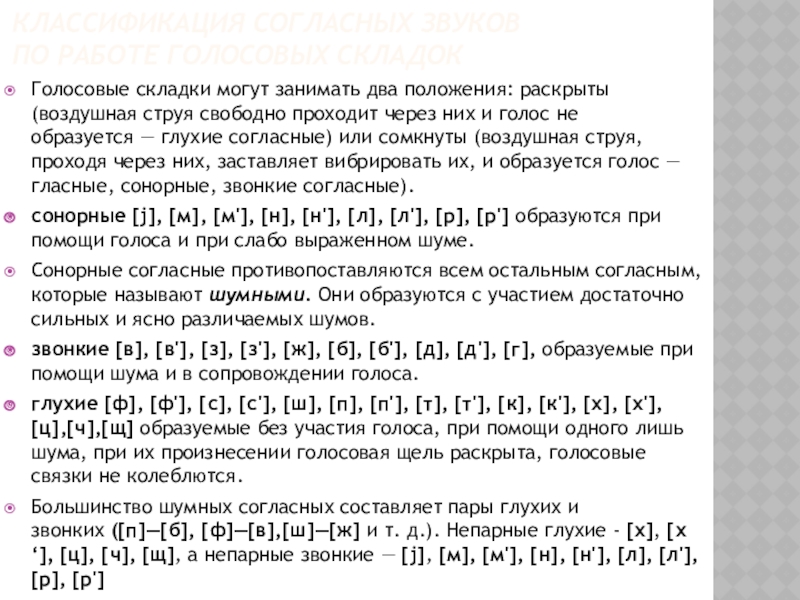 Большинство шумных согласных составляет пары глухих и звонких ([п]—[б], [ф]—[в],[ш]—[ж] и т. д.). Непарные глухие - [х], [х‘], [ц], [ч], [щ], а непарные звонкие — [j], [м], [м'], [н], [н'], [л], [л'], [р], [р']