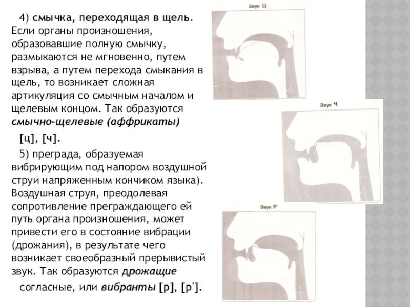 в щель, то возникает сложная артикуляция со смычным началом и щелевым концом. Так образуются смычно-щелевые (аффрикаты)