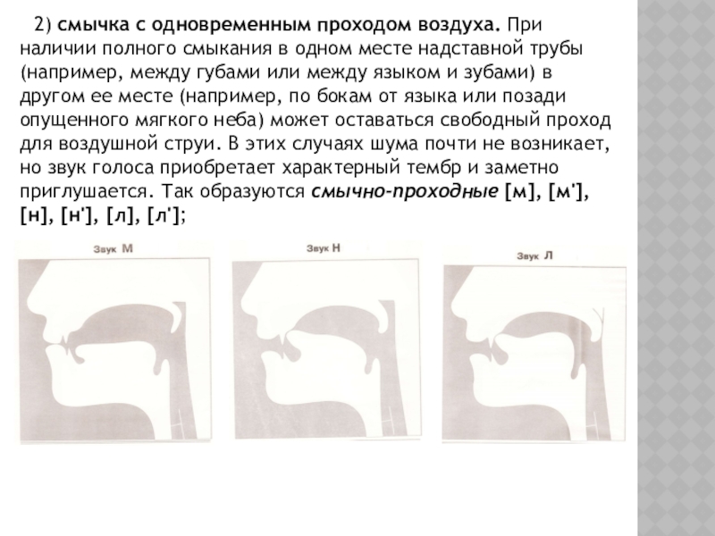 языком и зубами) в другом ее месте (например, по бокам от языка или позади опущенного мягкого неба) может оставаться свободный проход для воздушной струи. В этих случаях шума почти не возникает, но звук голоса приобретает характерный тембр и заметно приглушается. Так образуются смычно-проходные [м], [м'], [н], [н'], [л], [л'];