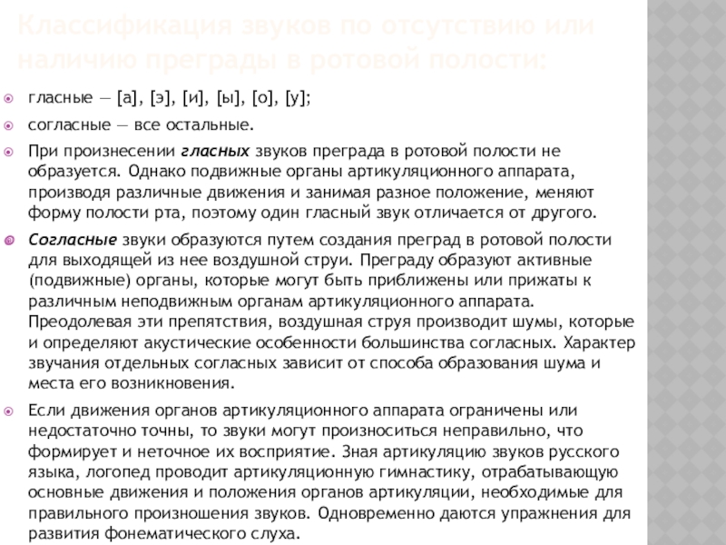 Слайд 4Классификация звуков по отсутствию или наличию преграды в ротовой полости: