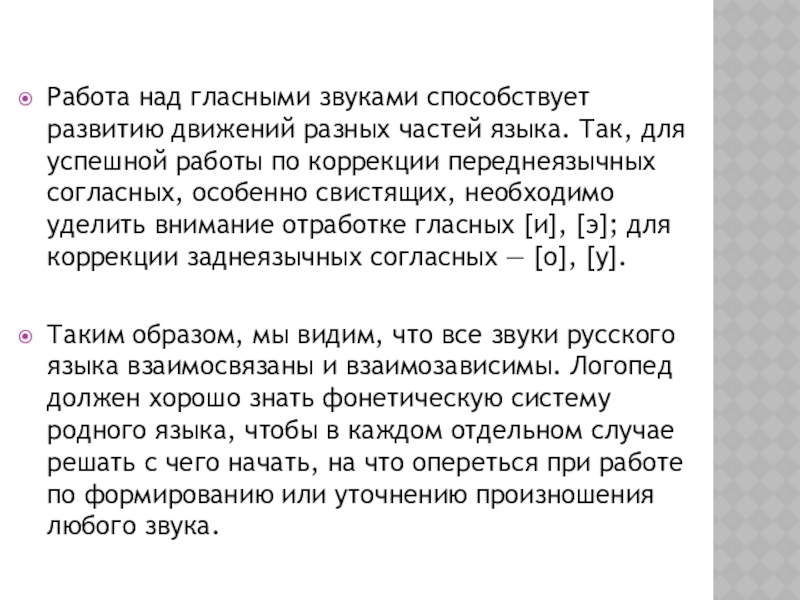 Звучность гласных влияет на плавность, слитность, выразительность речи, поэтому логопед должен отрабатывать и гласные звуки.