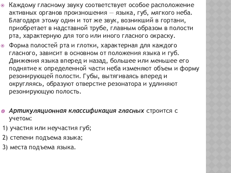 Общим для всех гласных звуков признаком, отличающим их артикуляцию от артикуляции всех согласных звуков, является отсутствие препятствий на пути выдыхаемого воздуха. Возникший в гортани звук в надставной трубе усиливается и воспринимается в виде чистого голоса без примеси шумов.