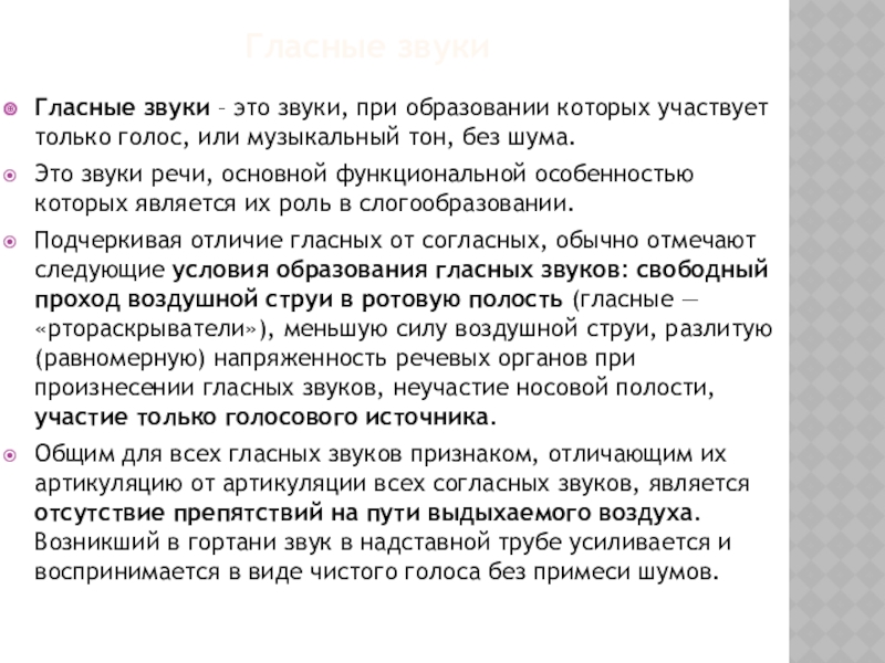 Подчеркивая отличие гласных от согласных, обычно отмечают следующие условия образования гласных звуков: свободный проход воздушной струи в ротовую полость (гласные — «ртораскрыватели»), меньшую силу воздушной струи, разлитую (равномерную) напряженность речевых органов при произнесении гласных звуков, неучастие носовой полости, участие только голосового источника.