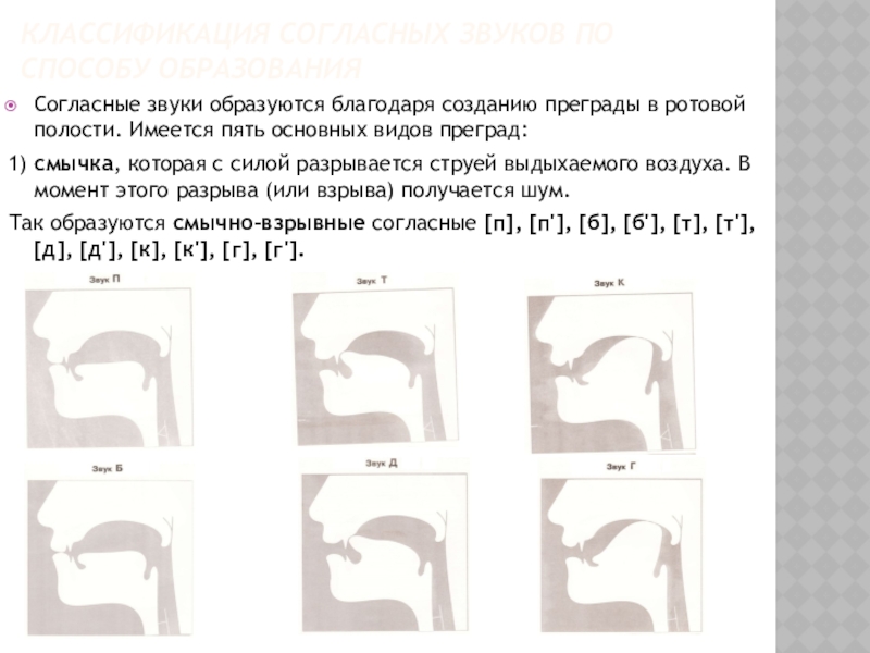 Так образуются смычно-взрывные согласные [п], [п'], [б], [б'], [т], [т'], [д], [д'], [к], [к'], [г], [г'].