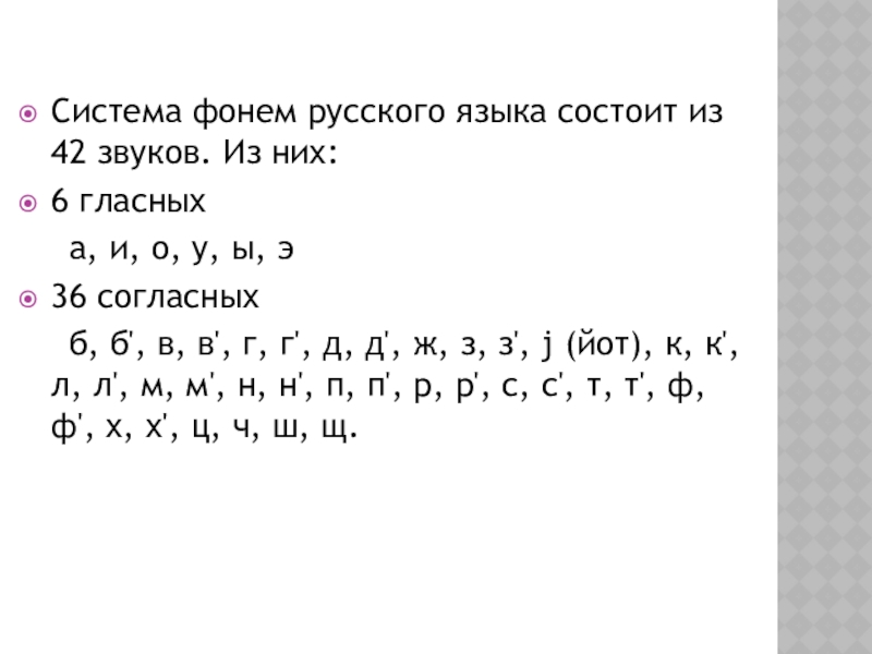 Слайд 3Система фонем русского языка состоит из 42 звуков. Из них: