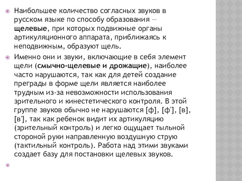 Именно они и звуки, включающие в себя элемент щели (смычно-щелевые и дрожащие), наиболее часто нарушаются, так как для детей создание преграды в форме щели является наиболее трудным из-за невозможности использования зрительного и кинестетического контроля. В этой группе звуков обычно не нарушаются [ф], [ф'], [в], [в'], так как ребенок видит их артикуляцию (зрительный контроль) и легко ощущает тыльной стороной руки направленную воздушную струю (тактильный контроль). Работа над этими звуками создает базу для постановки щелевых звуков.