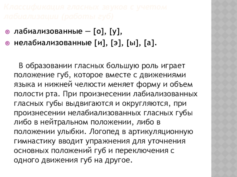 Слайд 21Классификация гласных звуков с учетом лабиализации (работы губ)