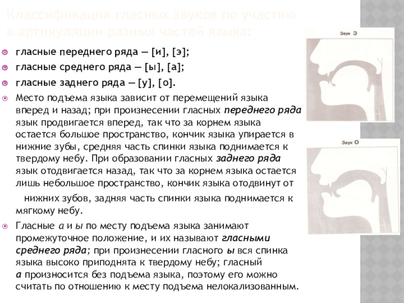 Место подъема языка зависит от перемещений языка вперед и назад; при произнесении гласных переднего ряда язык продвигается вперед, так что за корнем языка остается большое пространство, кончик языка упирается в нижние зубы, средняя часть спинки языка поднимается к твердому небу. При образовании гласных заднего ряда язык отодвигается назад, так что за корнем языка остается лишь небольшое пространство, кончик языка отодвинут от