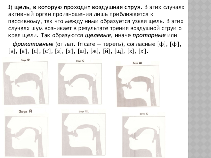 фрикативные (от лат. fricare — тереть), согласные [ф], [ф'], [в], [в'], [с], [с'], [з], [з'], [ш], [ж], [й], [щ], [х], [х'].