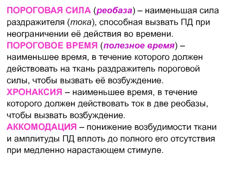Слайд 31ПОРОГОВАЯ СИЛА (реобаза) – наименьшая сила раздражителя (тока), способная вызвать