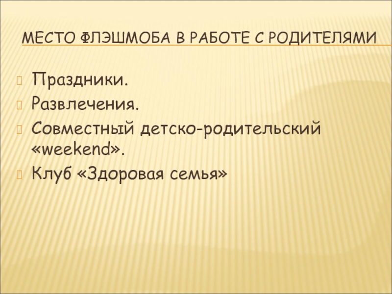 МЕСТО ФЛЭШМОБА В РАБОТЕ С РОДИТЕЛЯМИПраздники. Развлечения.Совместный детско-родительский «weekend».Клуб «Здоровая семья»