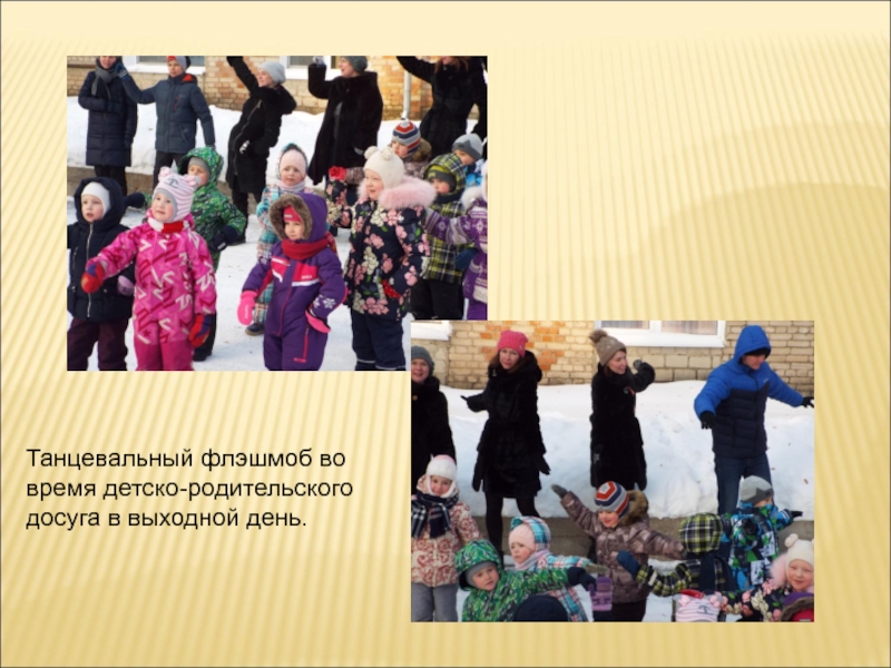 Слайд 8Танцевальный флэшмоб во время детско-родительского досуга в выходной день.