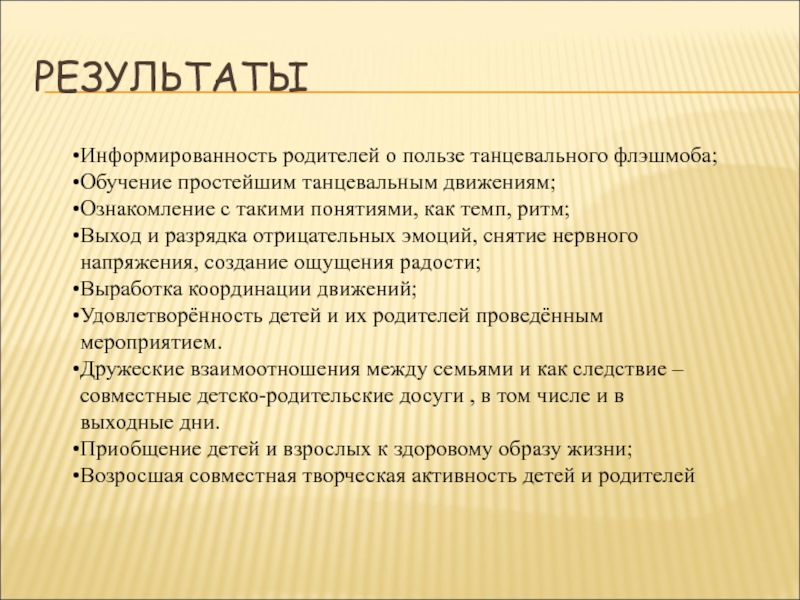 РЕЗУЛЬТАТЫ Информированность родителей о пользе танцевального флэшмоба;Обучение простейшим танцевальным движениям;Ознакомление с такими понятиями, как темп, ритм;Выход и