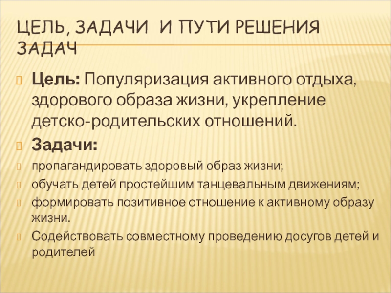 ЦЕЛЬ, ЗАДАЧИ И пути РЕШЕНИЯ ЗАДАЧЦель: Популяризация активного отдыха, здорового образа жизни, укрепление детско-родительских отношений.Задачи: пропагандировать здоровый образ жизни;обучать детей простейшим танцевальным движениям;формировать позитивное отношение к активному образу жизни.Содействовать совместному проведению