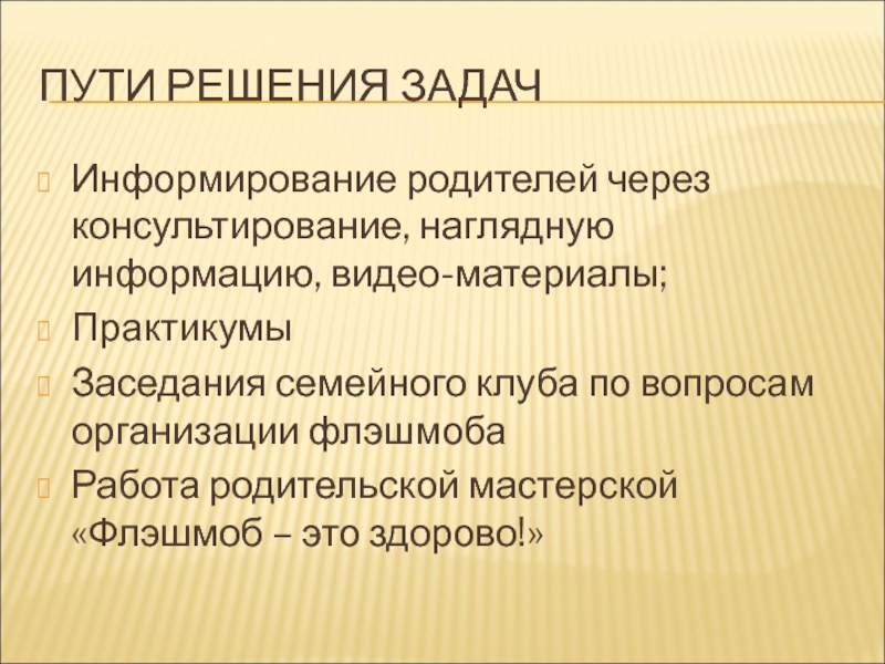 Пути решения задачИнформирование родителей через консультирование, наглядную информацию, видео-материалы;ПрактикумыЗаседания семейного клуба по вопросам организации флэшмобаРабота родительской мастерской