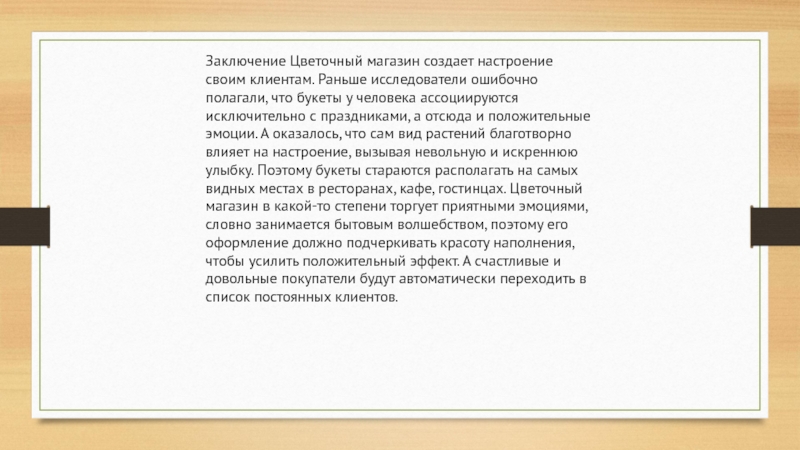 Слайд 12Заключение Цветочный магазин создает настроение своим клиентам. Раньше исследователи ошибочно