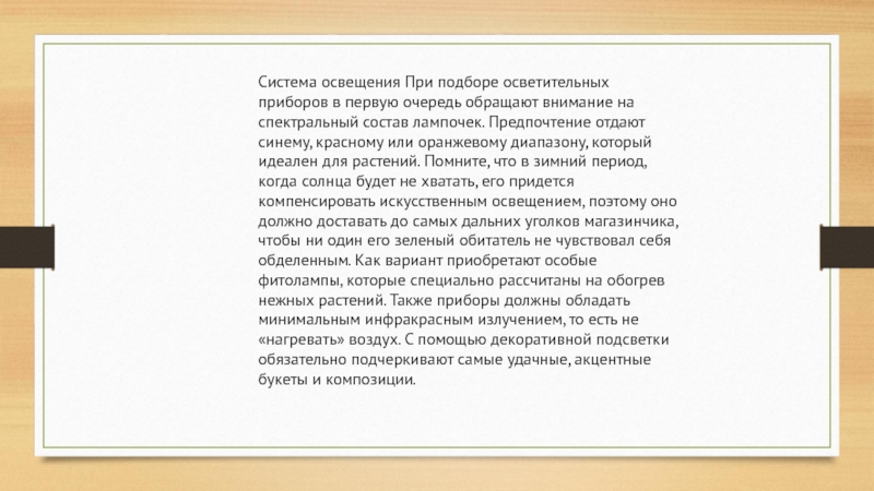 оранжевому диапазону, который идеален для растений. Помните, что в зимний период, когда солнца будет не хватать, его придется компенсировать искусственным освещением, поэтому оно должно доставать до самых дальних уголков магазинчика, чтобы ни один его зеленый обитатель не чувствовал себя обделенным. Как вариант приобретают особые фитолампы, которые специально рассчитаны на обогрев нежных растений. Также приборы должны обладать минимальным инфракрасным излучением, то есть не «нагревать» воздух. С помощью декоративной подсветки обязательно подчеркивают самые удачные, акцентные букеты и композиции.