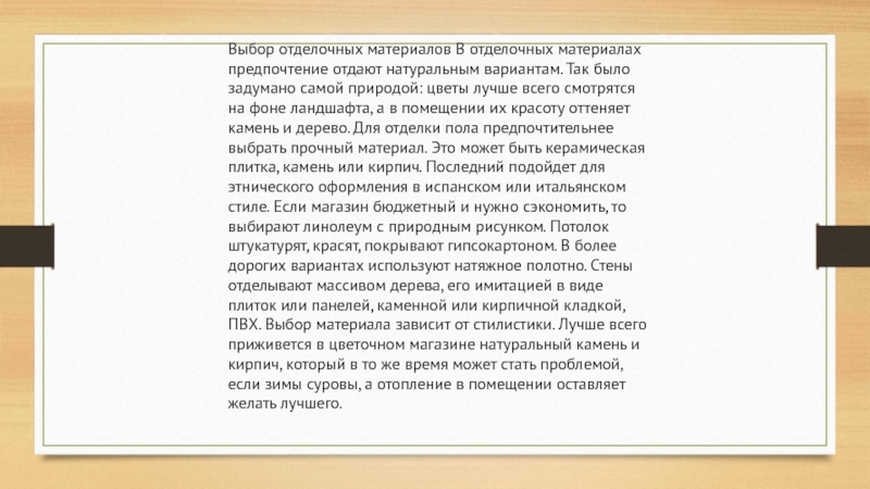 фоне ландшафта, а в помещении их красоту оттеняет камень и дерево. Для отделки пола предпочтительнее выбрать прочный материал. Это может быть керамическая плитка, камень или кирпич. Последний подойдет для этнического оформления в испанском или итальянском стиле. Если магазин бюджетный и нужно сэкономить, то выбирают линолеум с природным рисунком. Потолок штукатурят, красят, покрывают гипсокартоном. В более дорогих вариантах используют натяжное полотно. Стены отделывают массивом дерева, его имитацией в виде плиток или панелей, каменной или кирпичной кладкой, ПВХ. Выбор материала зависит от стилистики. Лучше всего приживется в цветочном магазине натуральный камень и кирпич, который в то же время может стать проблемой, если зимы суровы, а отопление в помещении оставляет желать лучшего.