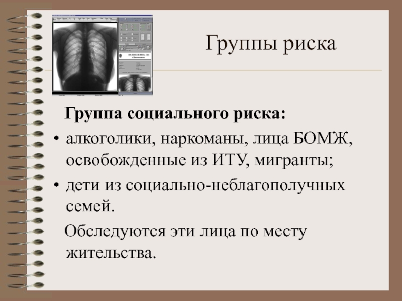 Обследуются во флюорографических кабинетах областных больниц, противотуберкулезного диспансера или на производстве разъездным флюорографом.