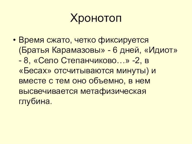 ХронотопВремя сжато, четко фиксируется (Братья Карамазовы» - 6 дней, «Идиот» - 8, «Село Степанчиково…» -2, в «Бесах»