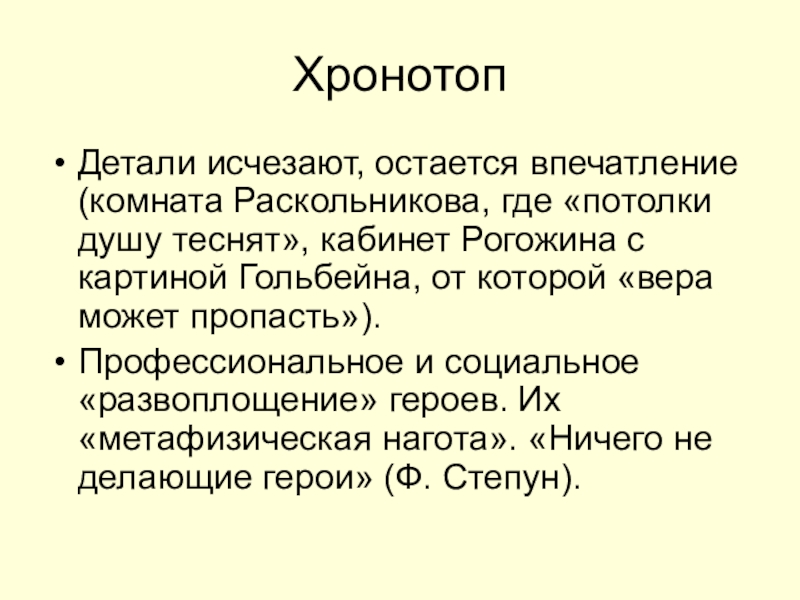 ХронотопДетали исчезают, остается впечатление (комната Раскольникова, где «потолки душу теснят», кабинет Рогожина с картиной Гольбейна, от которой