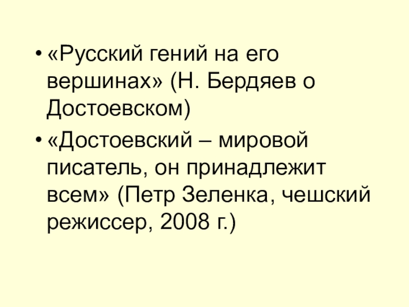 «Русский гений на его вершинах» (Н. Бердяев о Достоевском)«Достоевский – мировой писатель, он принадлежит всем» (Петр Зеленка,
