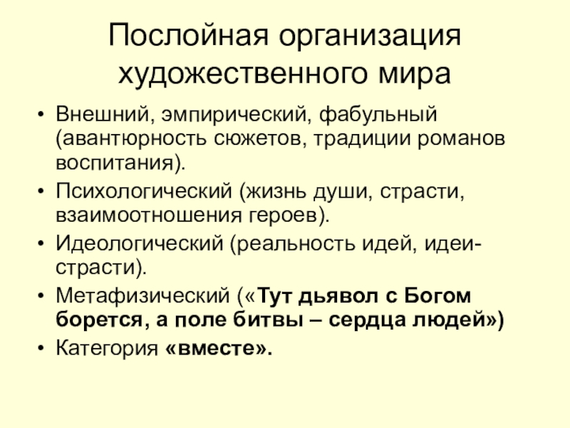 Послойная организация художественного мира Внешний, эмпирический, фабульный (авантюрность сюжетов, традиции романов воспитания).Психологический (жизнь души, страсти, взаимоотношения