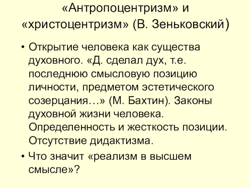 «Антропоцентризм» и «христоцентризм» (В. Зеньковский)Открытие человека как существа духовного. «Д. сделал дух, т.е. последнюю смысловую позицию личности,