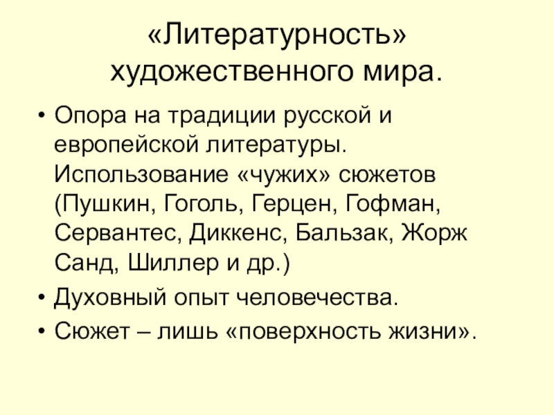 «Литературность» художественного мира.Опора на традиции русской и европейской литературы. Использование «чужих» сюжетов (Пушкин, Гоголь, Герцен, Гофман, Сервантес,