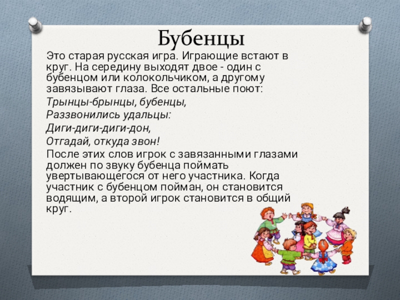 После этих слов игрок с завязанными глазами должен по звуку бубенца поймать увертывающегося от него участника. Когда участник с бубенцом пойман, он становится водящим, а второй игрок становится в общий круг.
