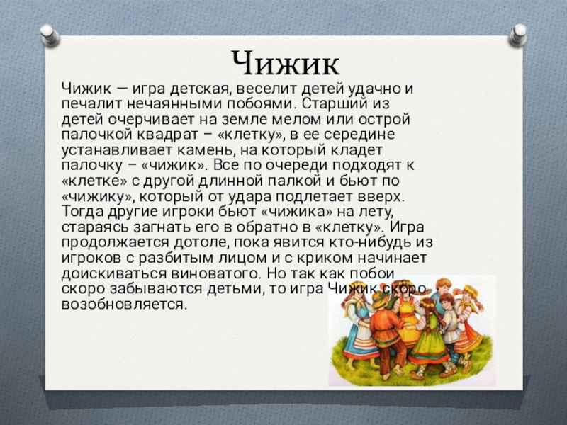 Чижик — игра детская, веселит детей удачно и печалит нечаянными