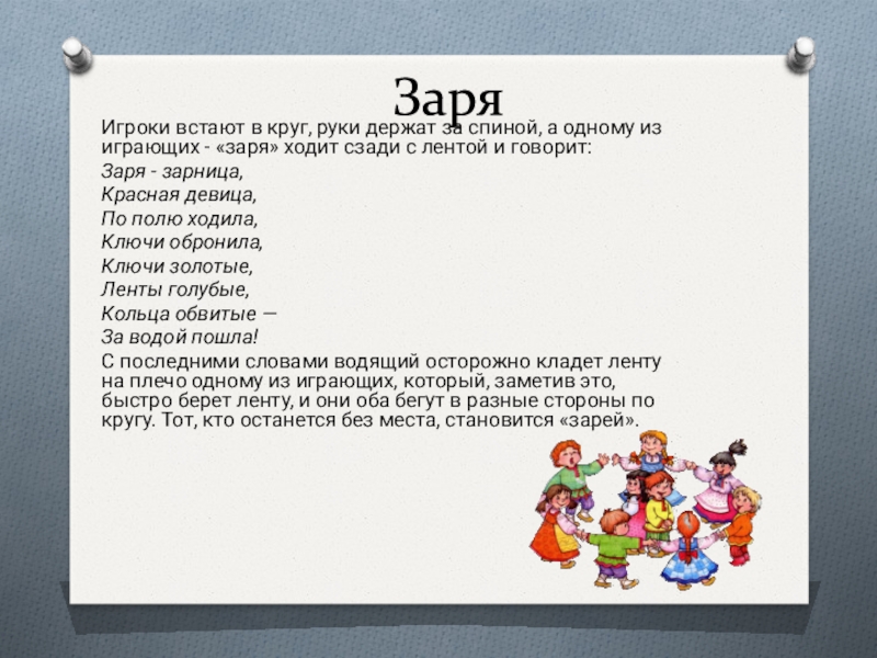 С последними словами водящий осторожно кладет ленту на плечо одному из играющих, который, заметив это, быстро берет ленту, и они оба бегут в разные стороны по кругу. Тот, кто останется без места, становится «зарей».