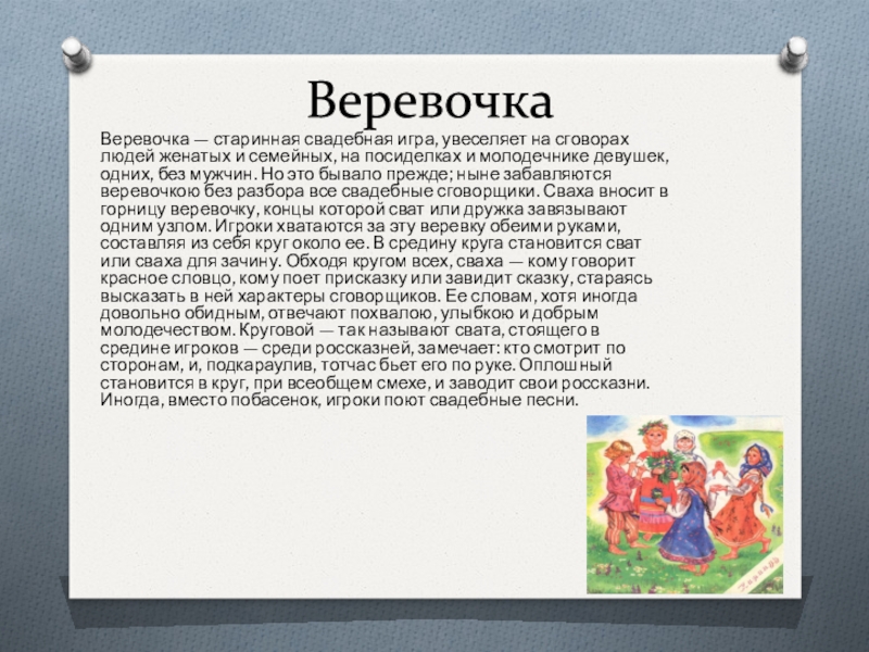 Веревочка — старинная свадебная игра, увеселяет на сговорах людей женатых