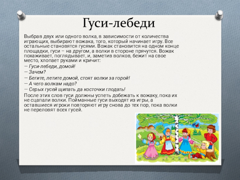выбирают вожака, того, который начинает игру. Все остальные становятся гусями.