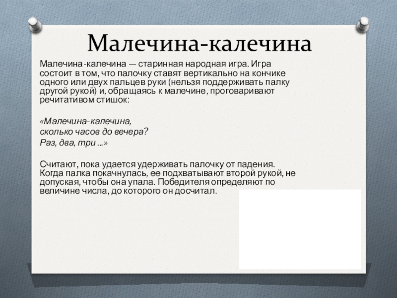 Малечина-калечина — старинная народная игра. Игра состоит в том, что