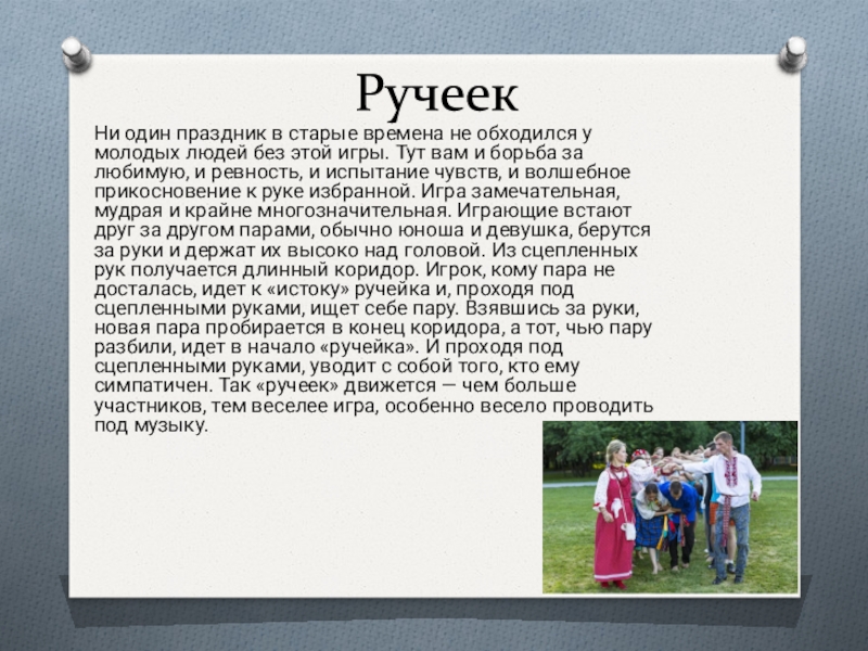 и ревность, и испытание чувств, и волшебное прикосновение к руке избранной. Игра замечательная, мудрая и крайне многозначительная. Играющие встают друг за другом парами, обычно юноша и девушка, берутся за руки и держат их высоко над головой. Из сцепленных рук получается длинный коридор. Игрок, кому пара не досталась, идет к «истоку» ручейка и, проходя под сцепленными руками, ищет себе пару. Взявшись за руки, новая пара пробирается в конец коридора, а тот, чью пару разбили, идет в начало «ручейка». И проходя под сцепленными руками, уводит с собой того, кто ему симпатичен. Так «ручеек» движется — чем больше участников, тем веселее игра, особенно весело проводить под музыку.