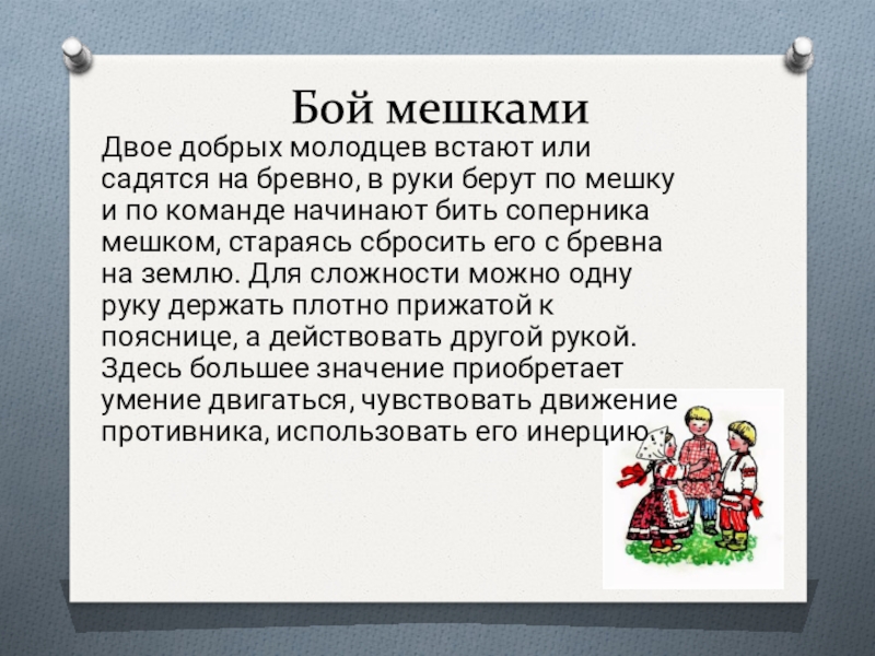 мешком, стараясь сбросить его с бревна на землю. Для сложности можно одну руку держать плотно прижатой к пояснице, а действовать другой рукой. Здесь большее значение приобретает умение двигаться, чувствовать движение противника, использовать его инерцию.