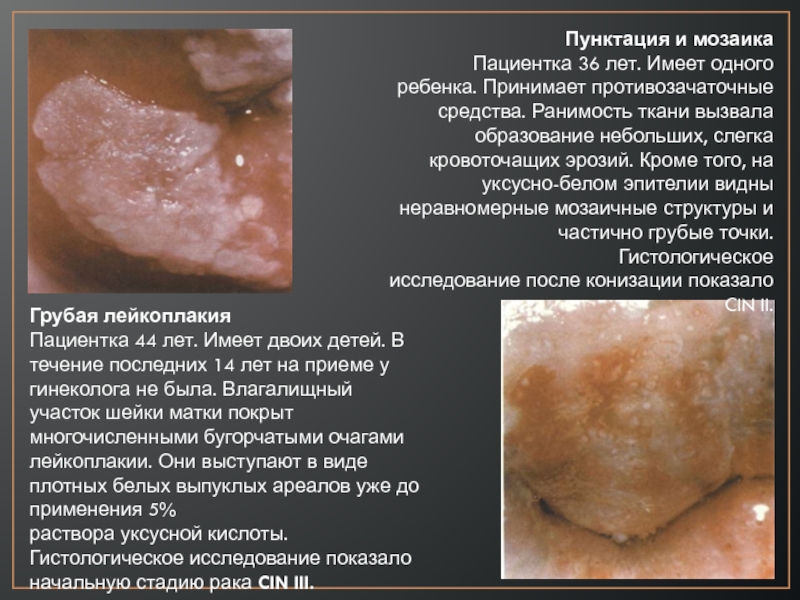 Пациентка 36 лет. Имеет одного ребенка. Принимает противозачаточные средства. Ранимость ткани вызвала образование небольших, слегка кровоточащих эрозий. Кроме того, на уксусно-белом эпителии видны неравномерные мозаичные структуры и частично грубые точки.