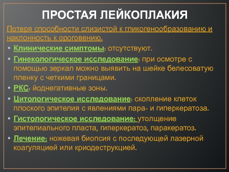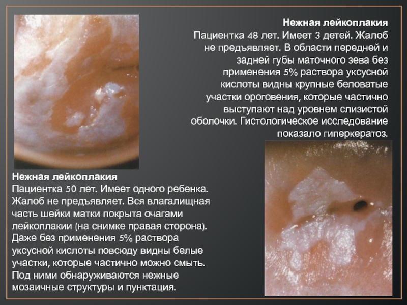 Пациентка 48 лет. Имеет 3 детей. Жалоб не предъявляет. В области передней и задней губы маточного зева без применения 5% раствора уксусной кислоты видны крупные беловатые участки ороговения, которые частично выступают над уровнем слизистой оболочки. Гистологическое исследование показало гиперкератоз.